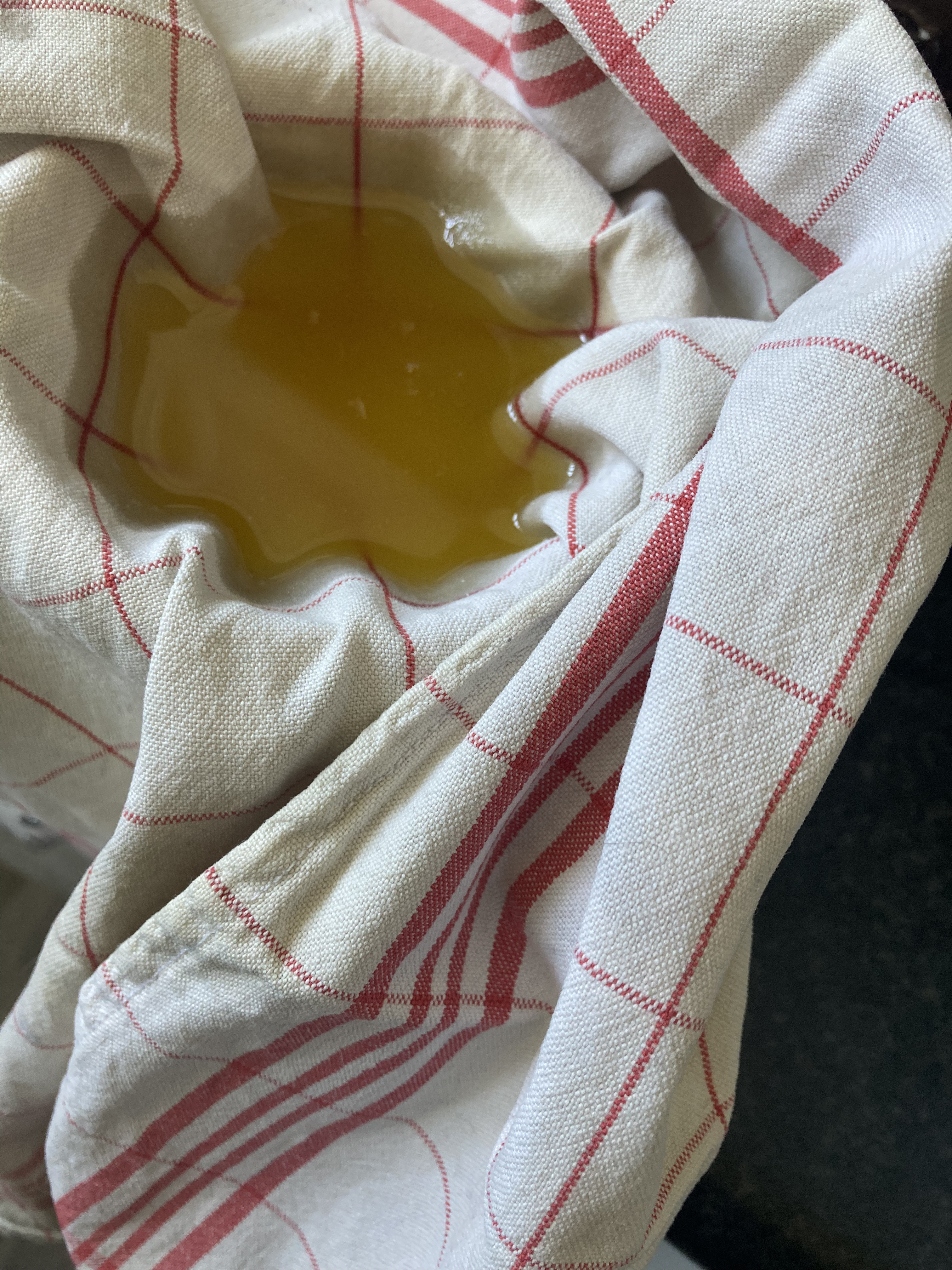 - Lorsqu’il ne reste plus qu’un liquide jaune d’or, coupez le feu et versez dans votre étamine positionnée sur une passoire au dessus de votre récipient