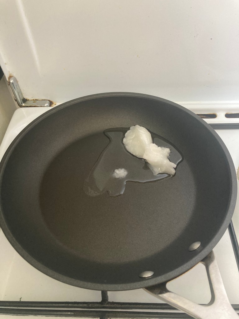 - Faites fondre l’huile de coco dans une poêle puis ajoutez les graines de moutarde
