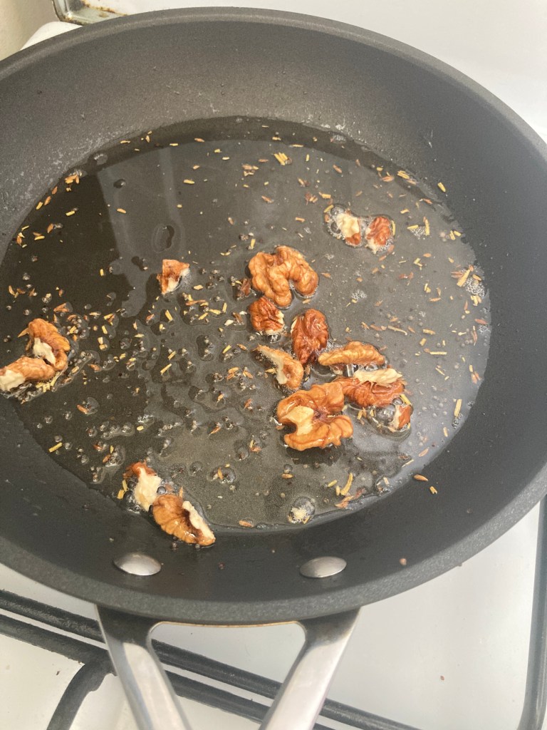 - Lorsqu’elles commencent à sauter (comme du pop-corn), baissez le feu et ajoutez le cumin et le romarin. Laissez griller une vingtaine de secondes puis ajoutez les noix et remuez pendant 3 à 4 minutes (elles doivent se colorer légèrement mais pas bruler)