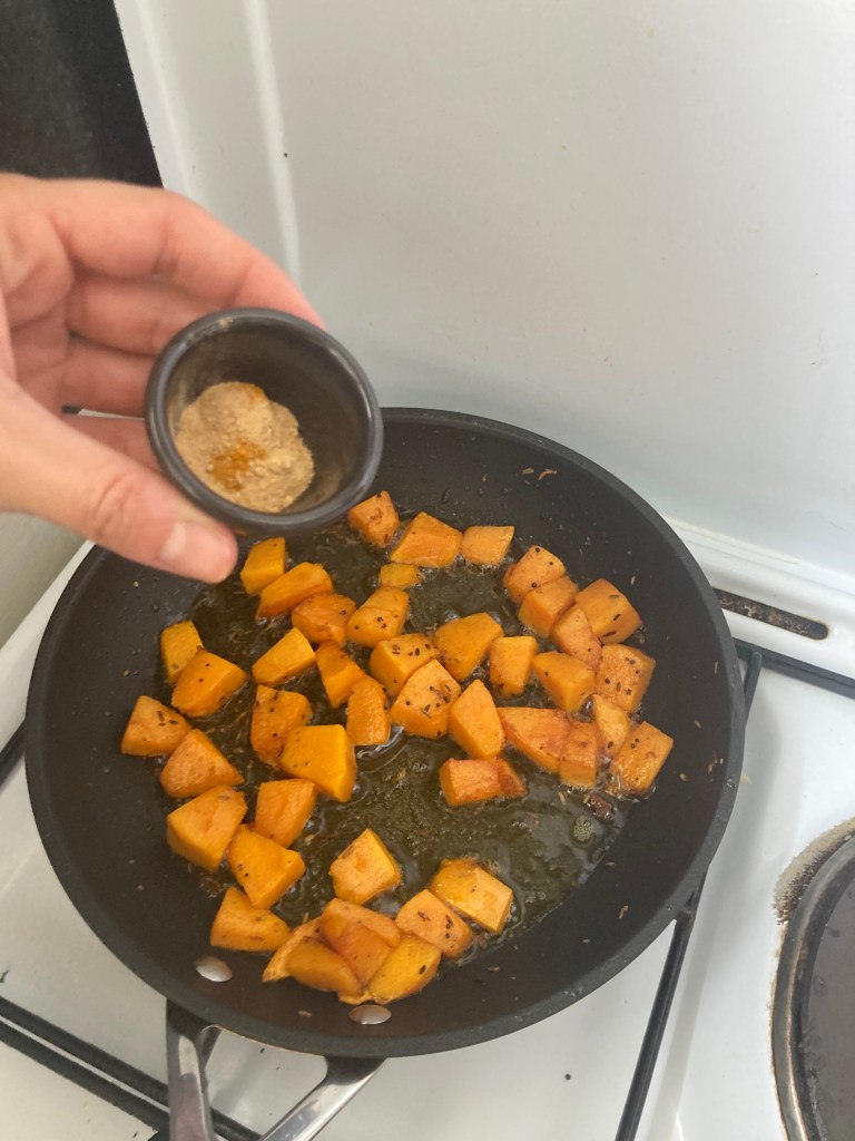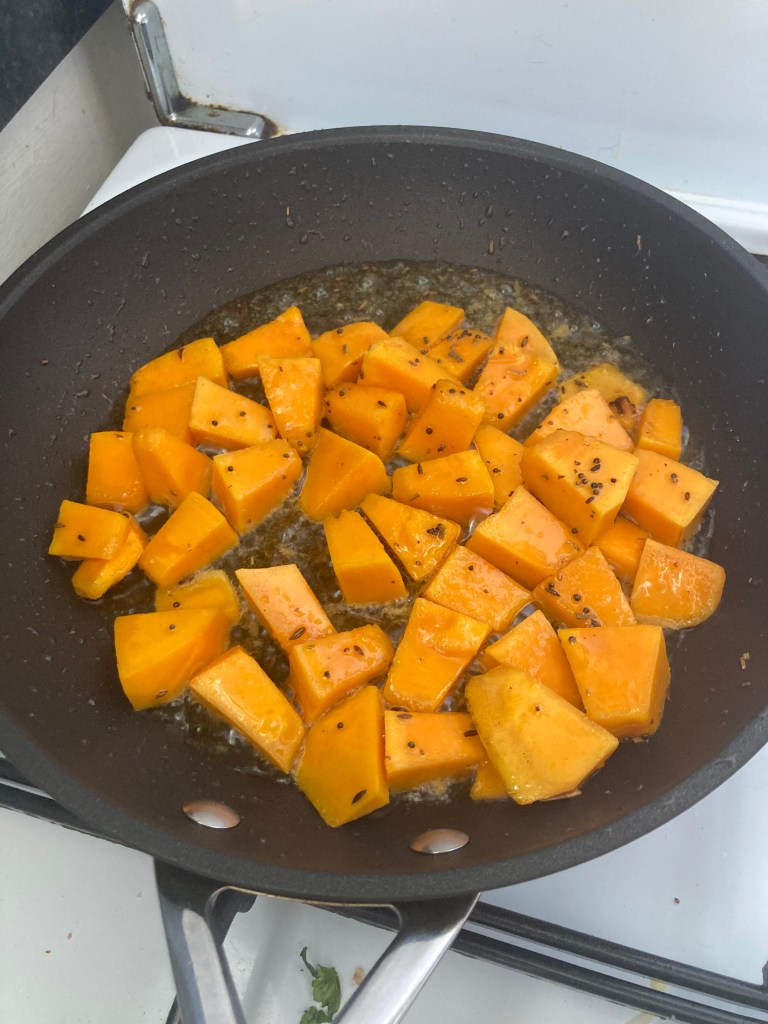 - Retirez les noix de la poêle, réservez-les et ajoutez à la place les dés de potimarron