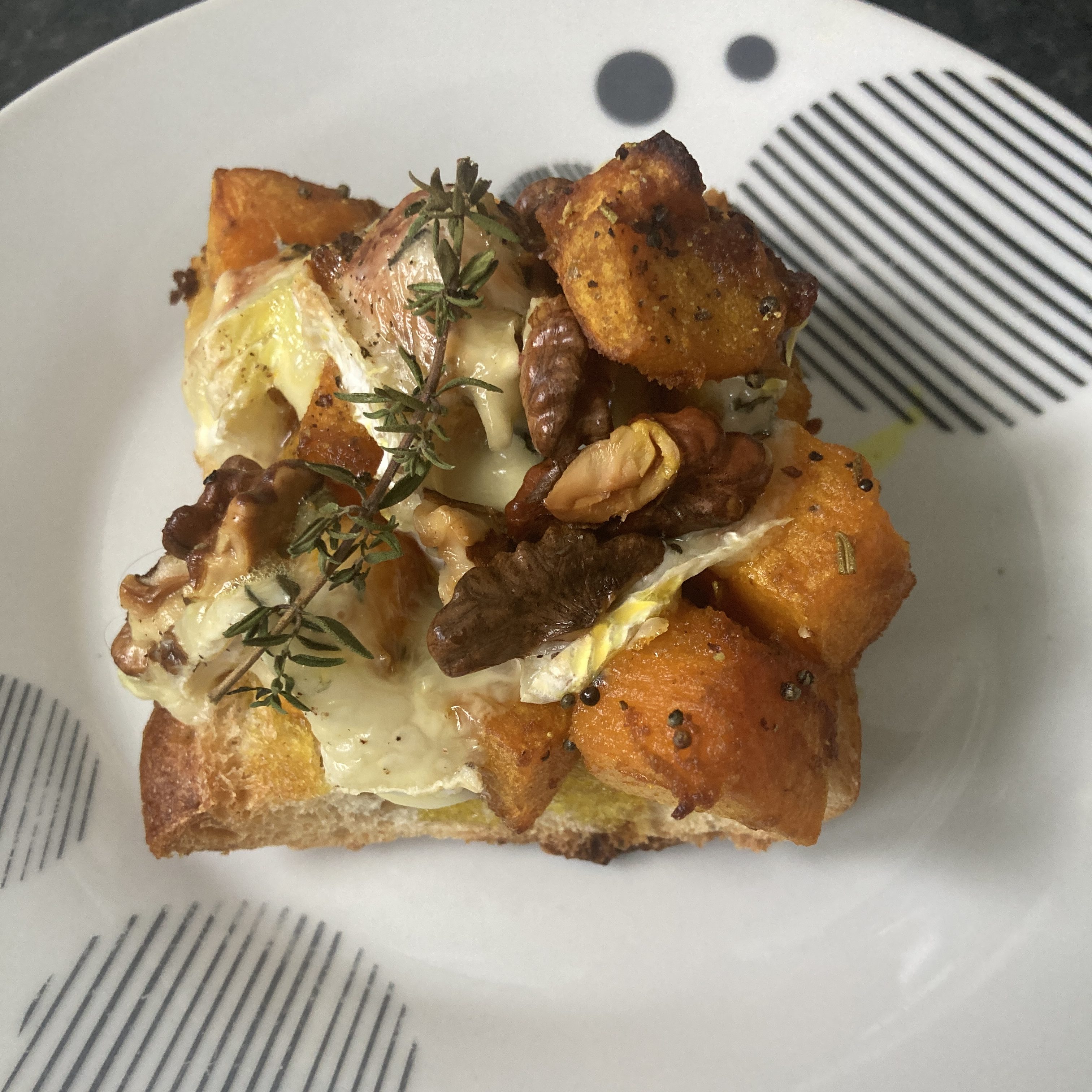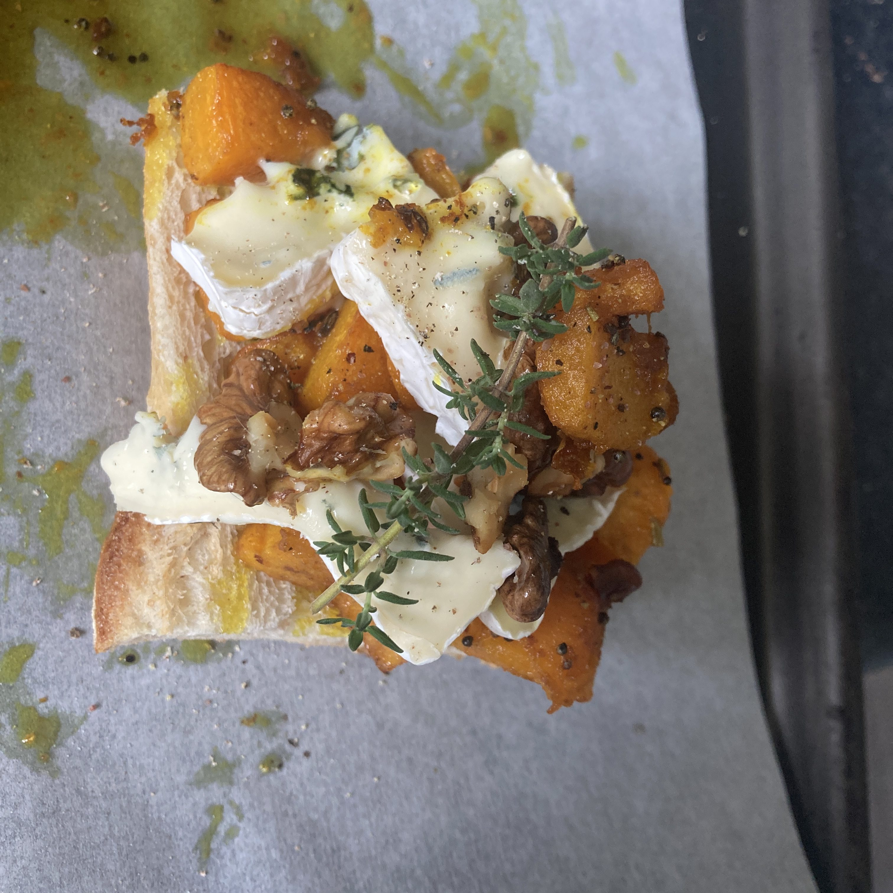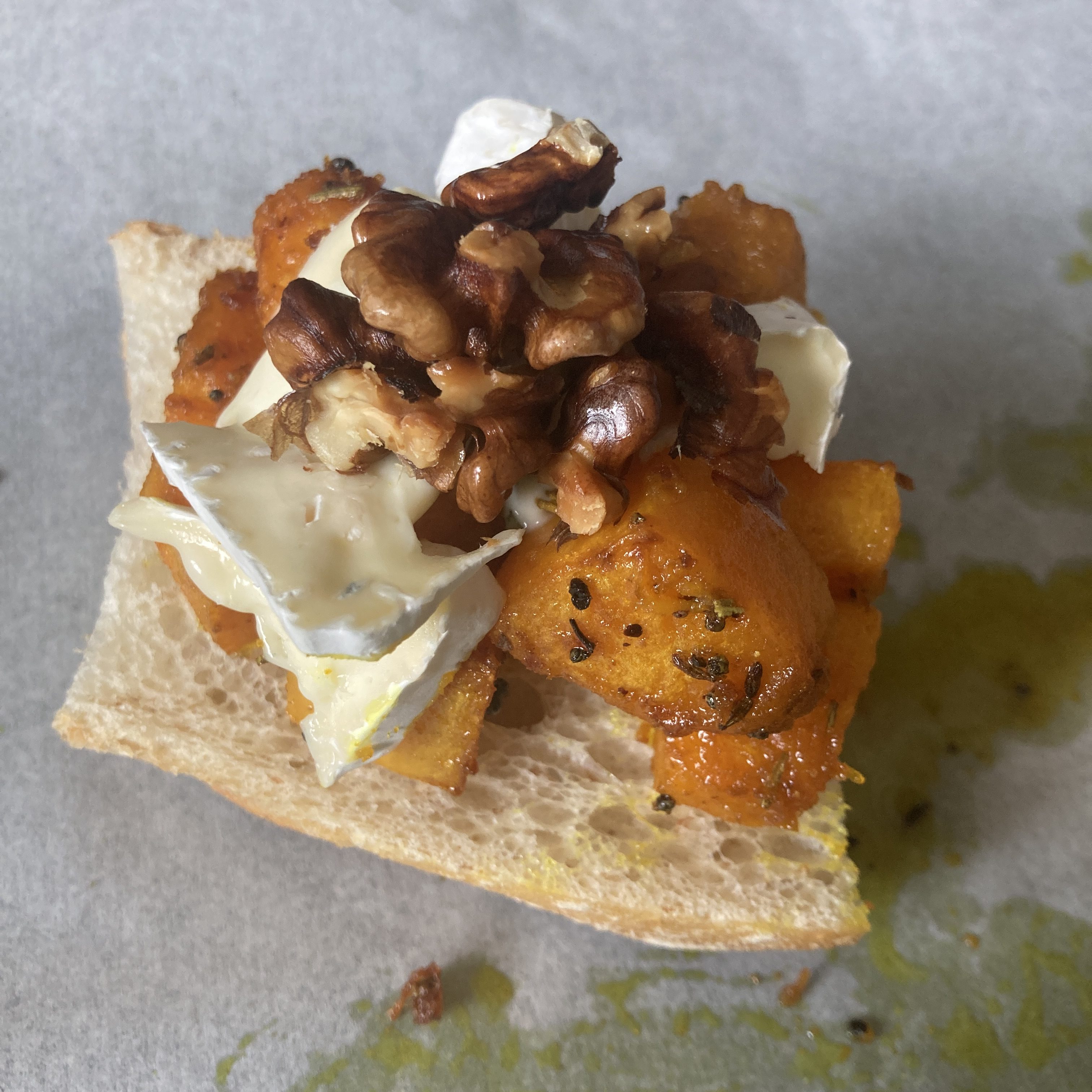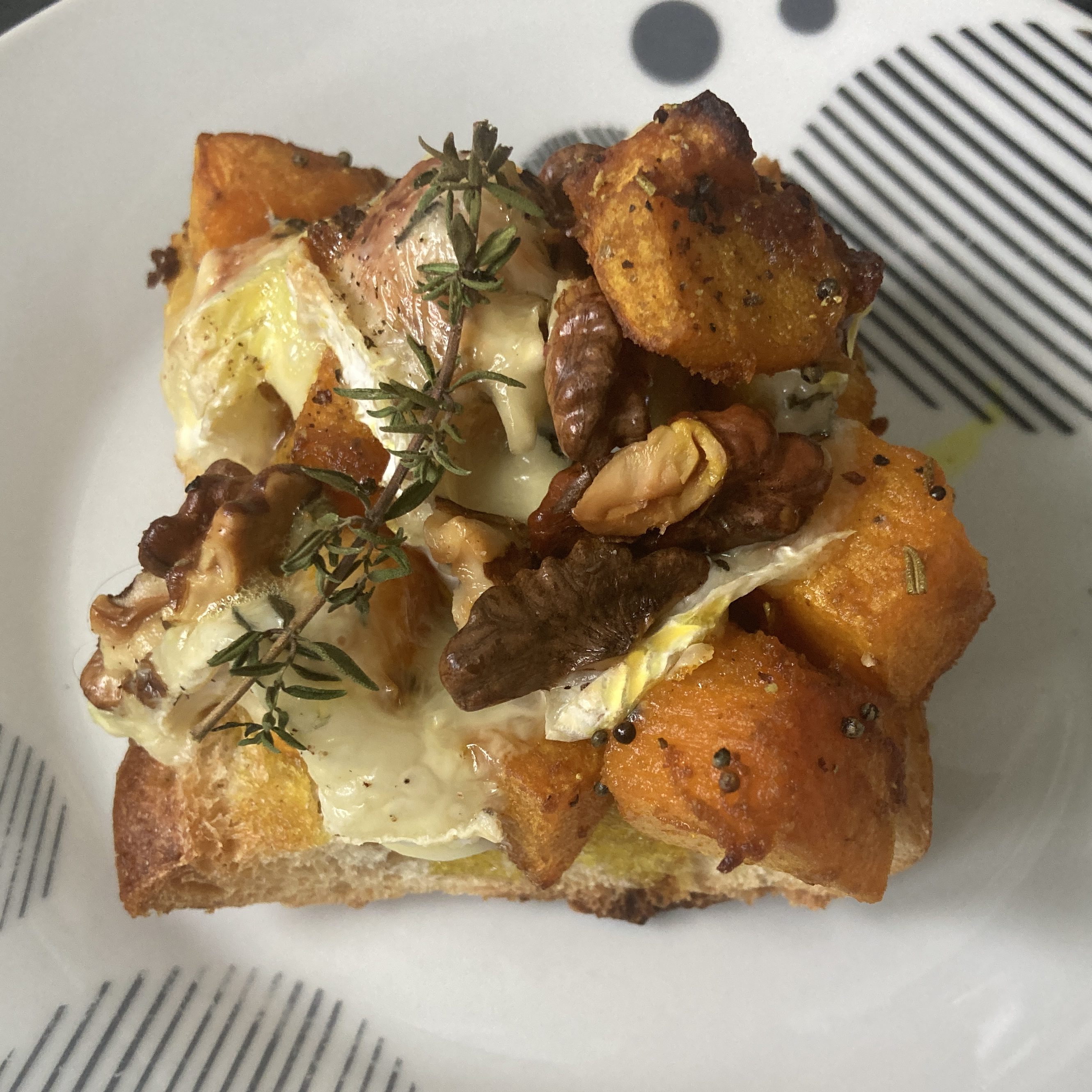 - Posez d’abord les dés de potimarron, puis les tranches de fromage et enfin les noix