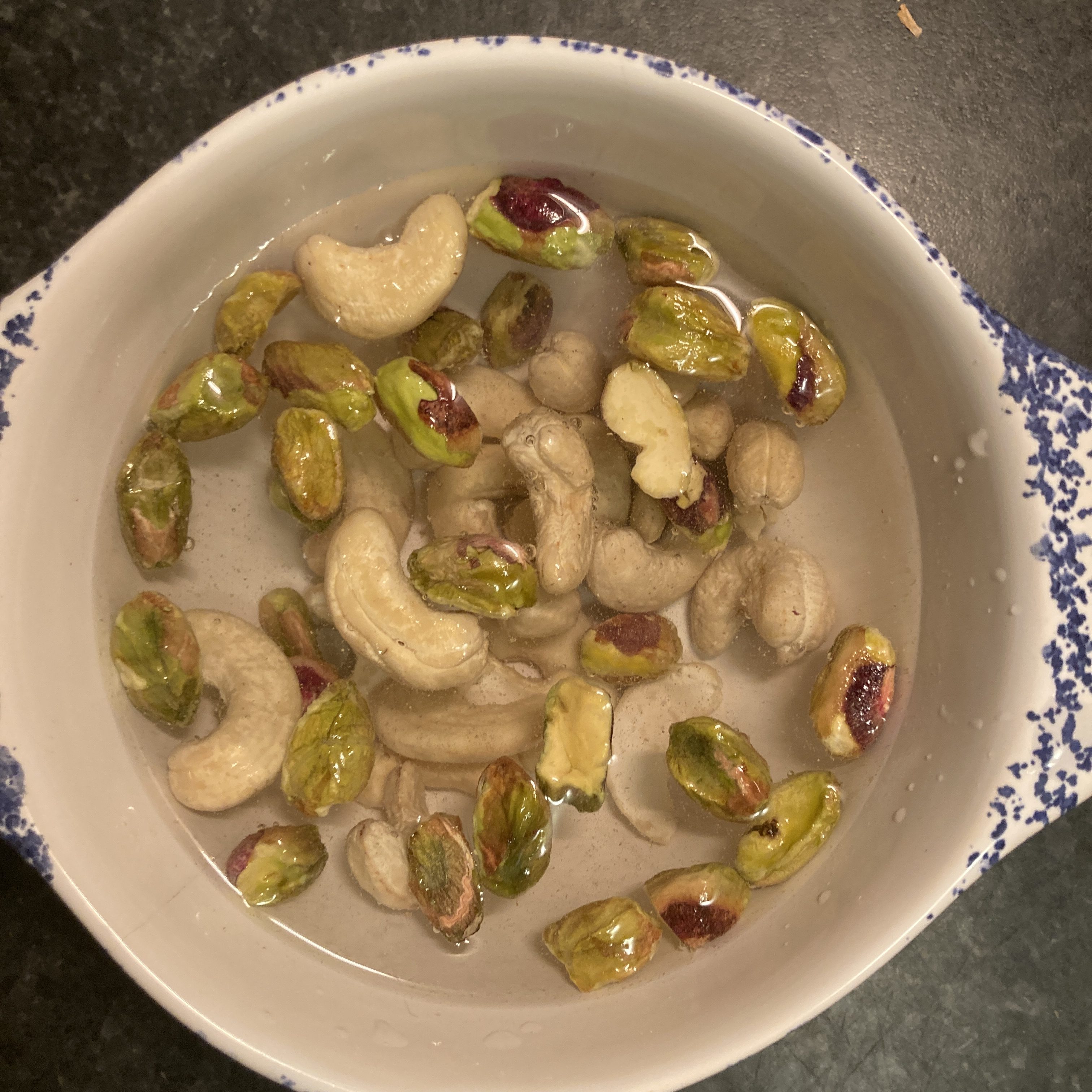 - Quelques heures avant le repas, faites tremper les noix et le riz dans deux récipients séparés