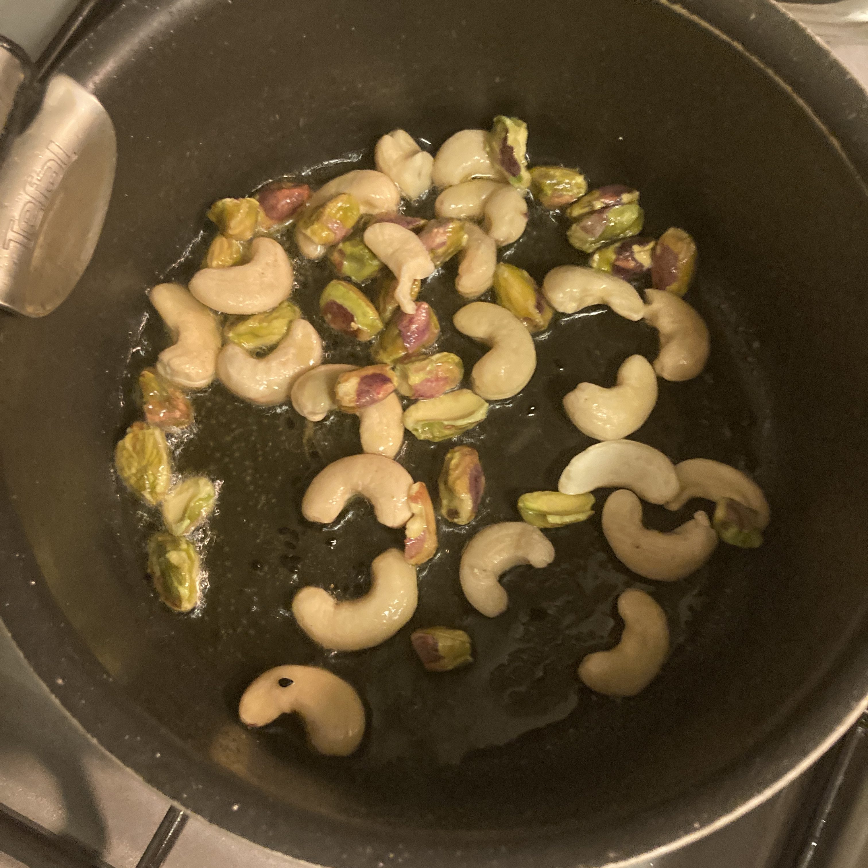 - Lorsque l’huile est chaude, placez les épices entières, puis les oléagineux. Laissez frémir quelques secondes à feu moyen, pour les colorer légèrement sans les bruler