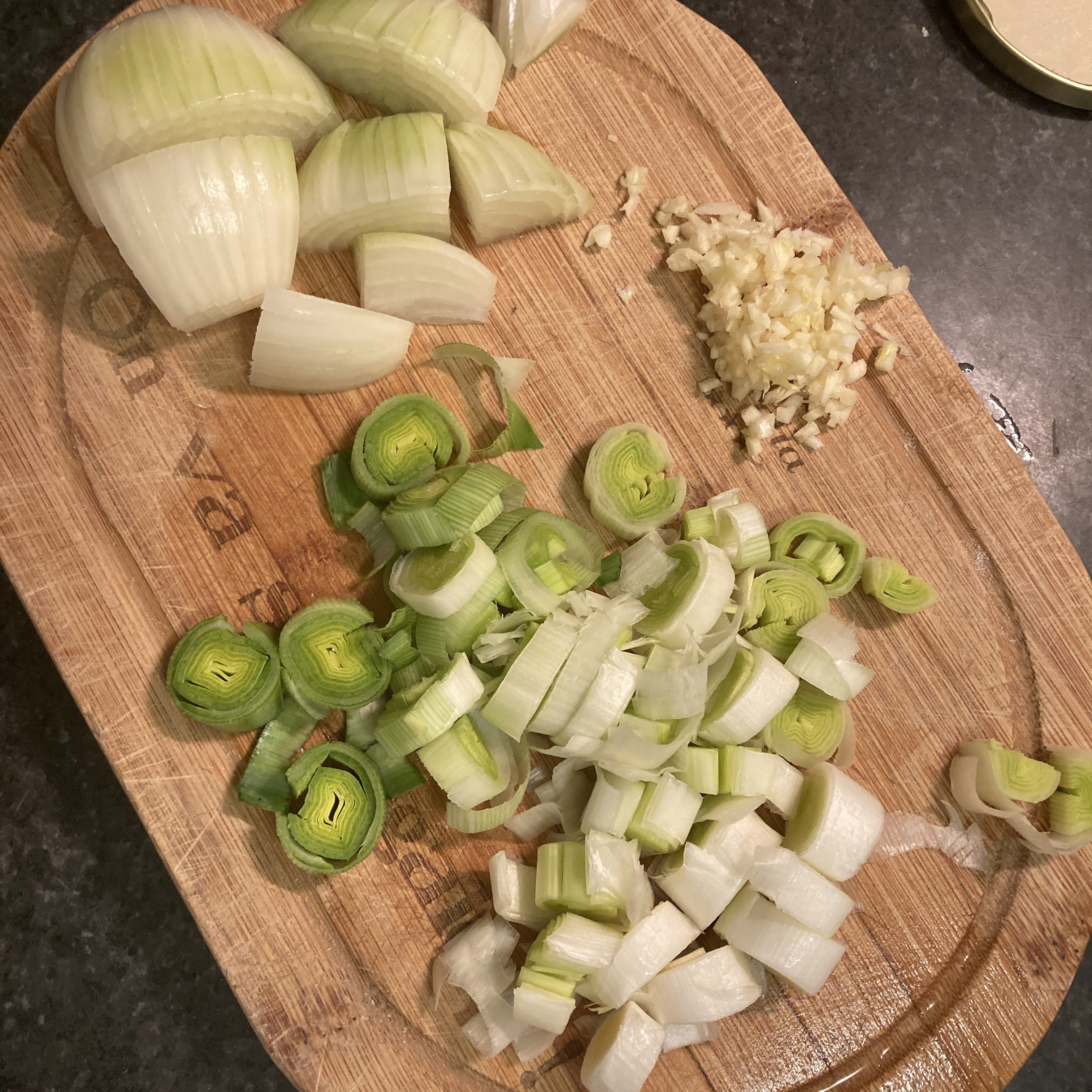 - Remuez durant quelques instants jusqu’à ce que l’oignon devienne légèrement translucide, puis ajoutez les poireaux
