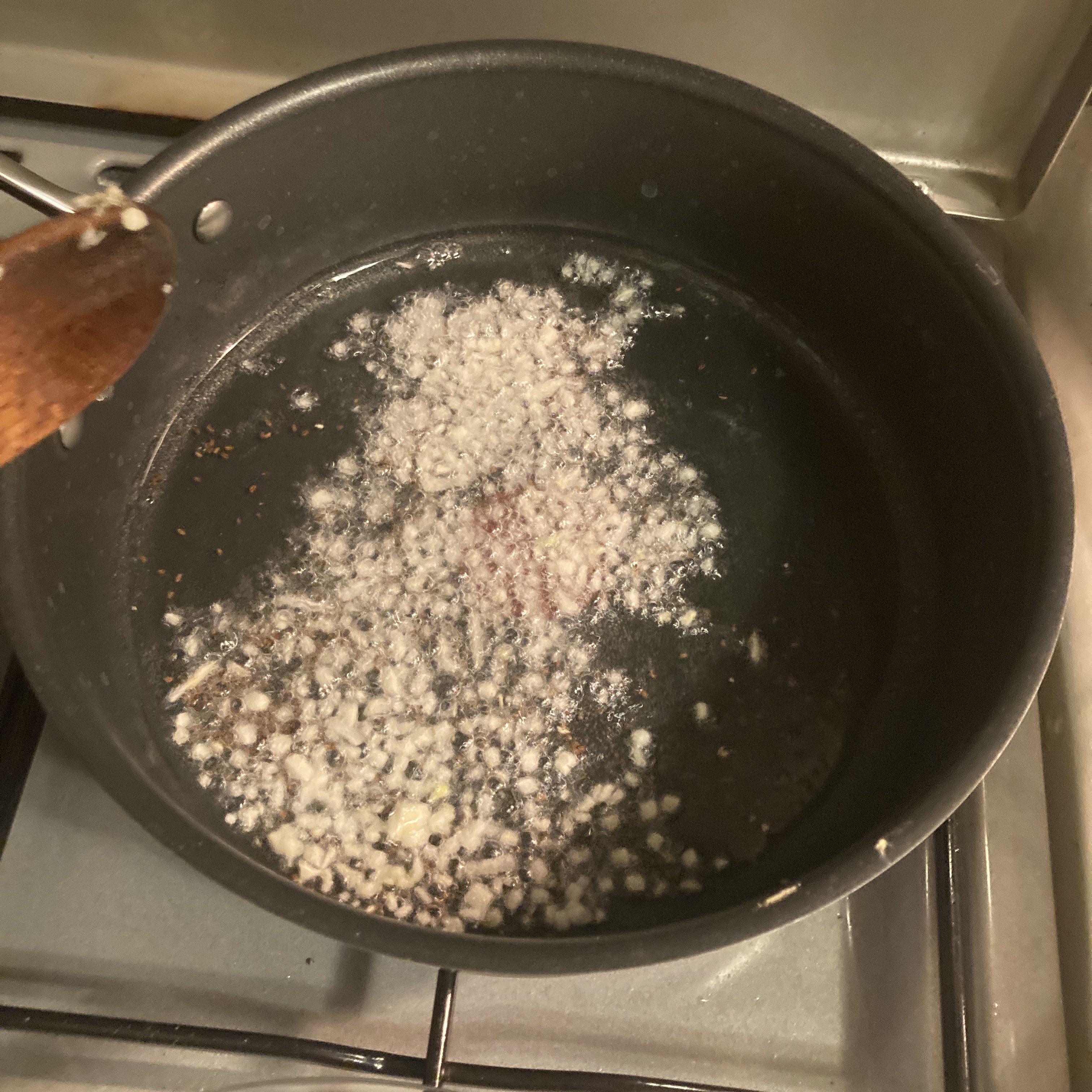 - Versez l’ail, laissez griller quelques secondes, puis ajoutez l’oignon