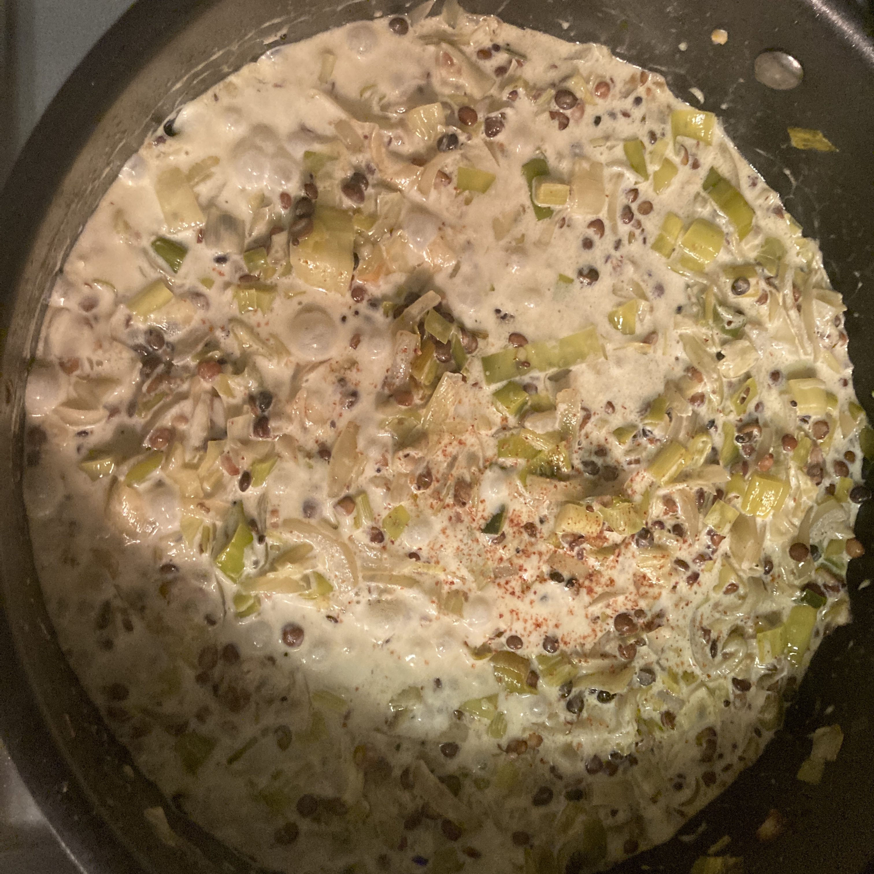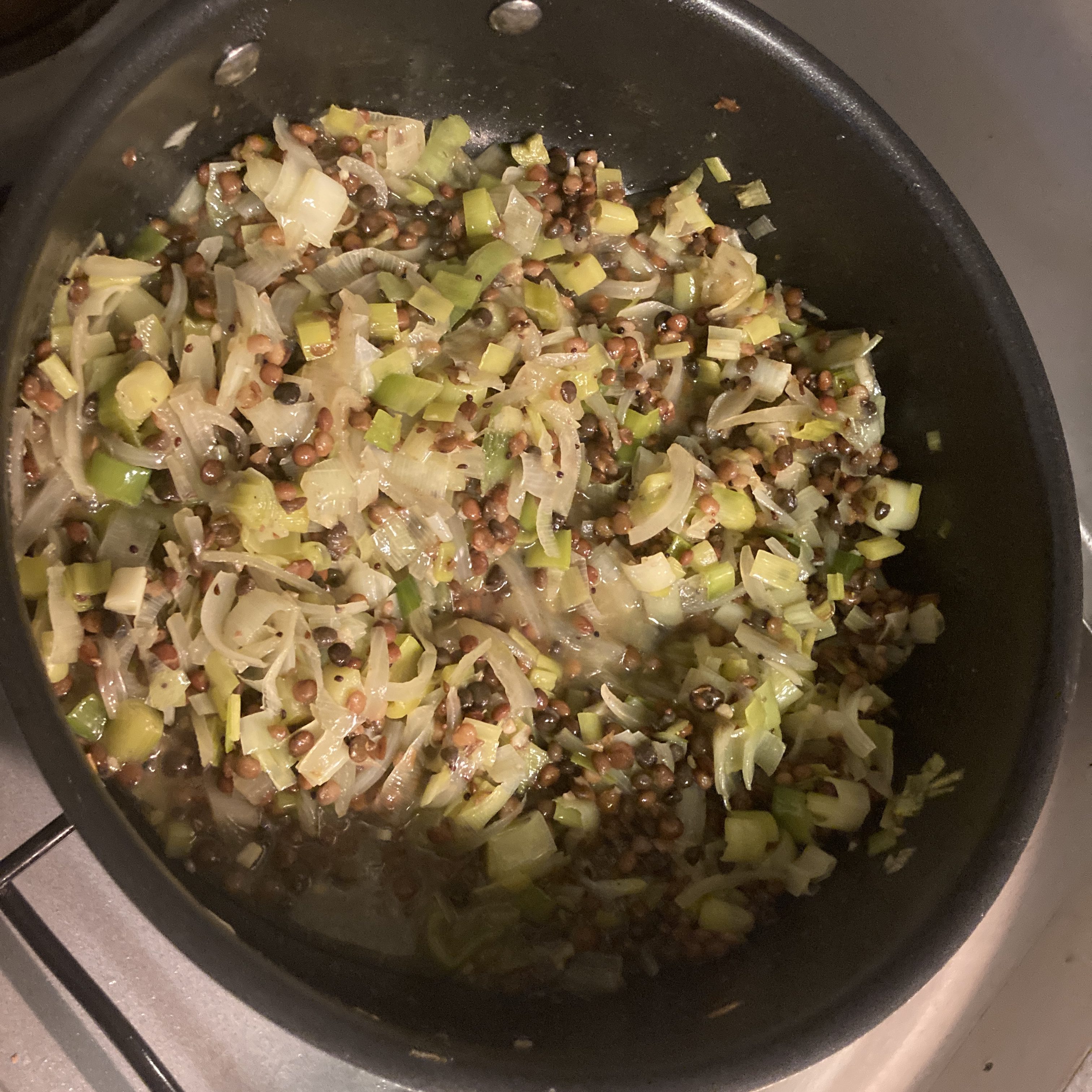 - Cuire environ 15 minutes à feu moyen, l’eau doit frémir mais les légumes ne doivent pas coller. Lorsque les poireaux sont bien ramollis, ajoutez les lentilles précuites et égouttées.